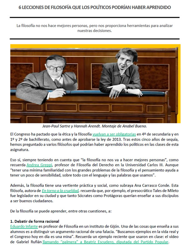El Congreso ha pactado que la ética y la filosofía vuelvan a ser obligatorias en 4º de secundaria y en 1º y 2º de bachillerato, como antes de aprobarse la ley de 2013. Tras estos cinco años de sequía, hemos preguntado a varios filósofos qué podrían haber aprendido los políticos en las clases de esta asignatura.
