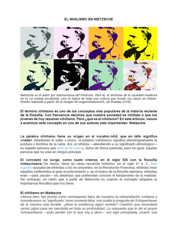 Nietzsche es el autor por antonomasia del nihilismo. Para él, el nihilismo de la sociedad moderna no es un estado accidental, sino la lógica de toda una cultura que hunde sus raíces en Platón. Diseño realizado a partir de la imagen de eugeniohansenofs, de Pixabay (CC0).