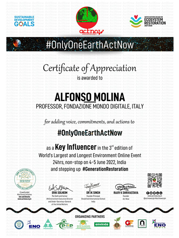 MIEMBRO DE ÉTICA&VALORES ES CONSIDERADO INFLUENCIADOR CLAVE / #OnlyOneEarthActNow... Certificate of Appreciation Is awarded to Alfonso Molina - Eticay valores.cl - Chile