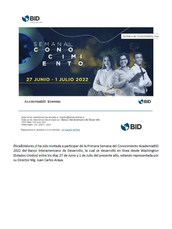Ética&Valores.cl ha sido invitada a participar de la Primera Semana del Conocimiento AcademiaBID 2022 del Banco Interamericano de Desarrollo, la cual se desarrolló en línea desde Washington (Estados Unidos) entre los días 27 de Junio y 1 de Julio del presente año, estando representada por su Director Mg. Juan Carlos Araya.