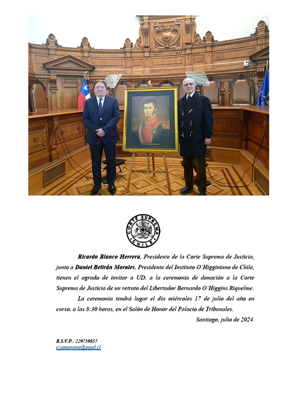El Presidente de la Corte Suprema de Justicia, Sr. Ricardo Blanco Herrera y el Director de Ética & Valores-Chile, Mg. Juan Carlos Araya, junto al retrato del Prócer Don Bernardo O"Higgins Riquelme, entregado por el Instituto O"Higginiano, en la Ceremonia Solemne realizada el día 17 de Julio de 2024.