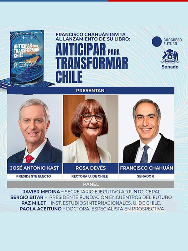 Por especial encargo del senador Francisco Chahuán Chahuán, tengo el agrado de invitarle al lanzamiento del libro Anticipar para Transformar Chile: una propuesta de institucionalidad del futuro, que se realizará en el marco de Congreso Futuro 2026.